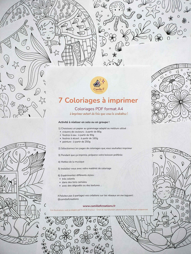 Fichier pdf de 8 pages A4 comprenant 1 page de notice et 7 pages de coloriages :