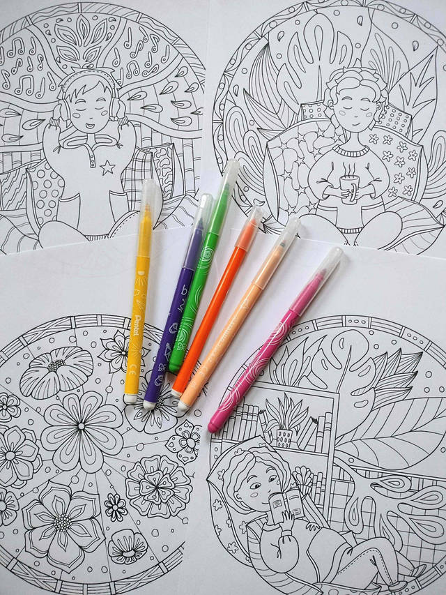 4 coloriages format "rosace" : Détente, Lecture, Musique et Fleurs
